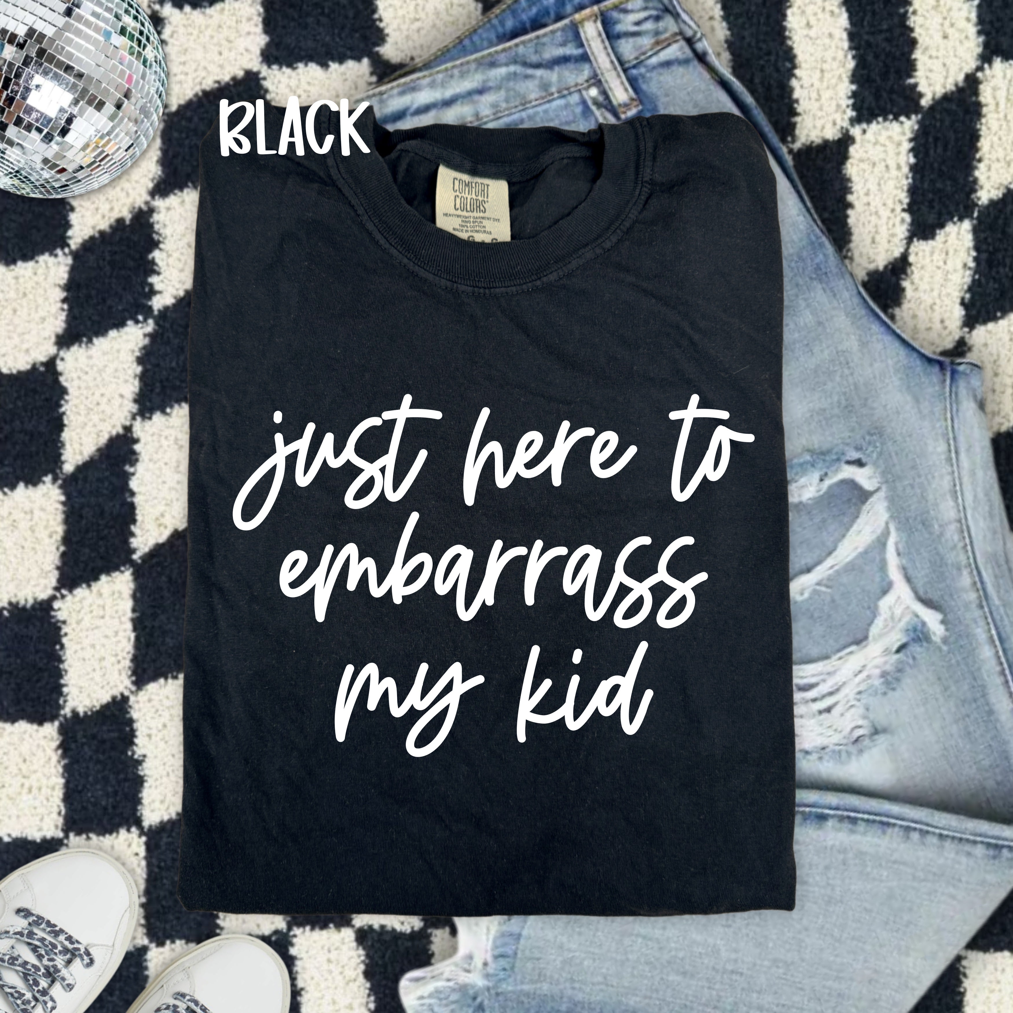 Just Here To Embarrass My Kid - HEAVY COTTON / SMALL is backordered and will ship as soon as it is back in stock.