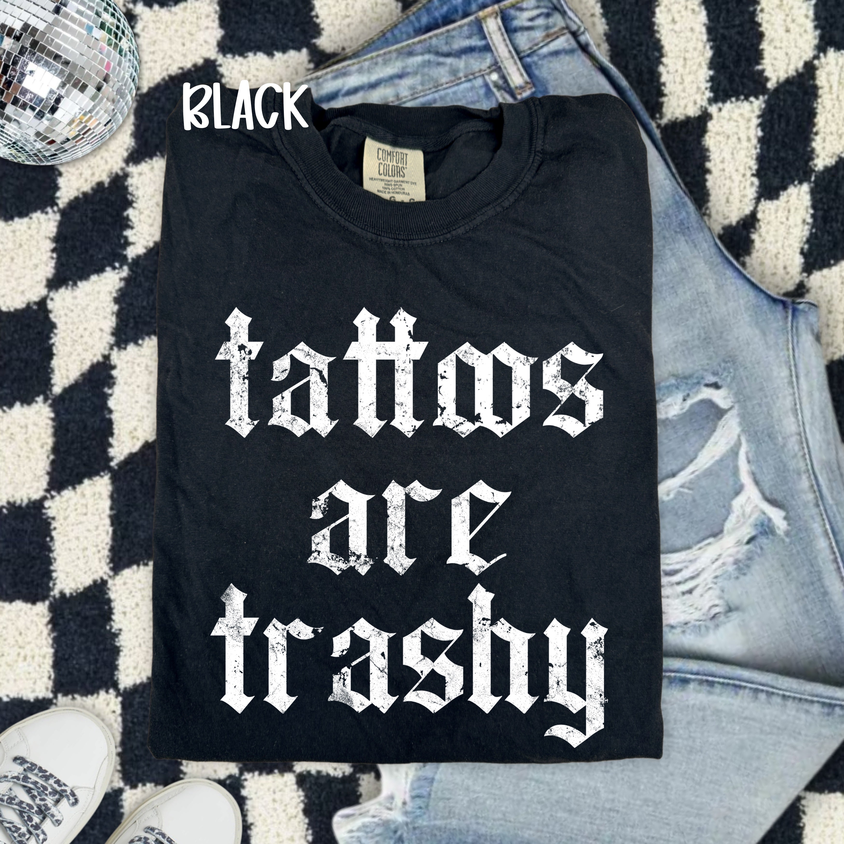 Tattoos Are Trashy Tee OR Sweatshirt - HEAVY COTTON / SMALL is backordered and will ship as soon as it is back in stock.