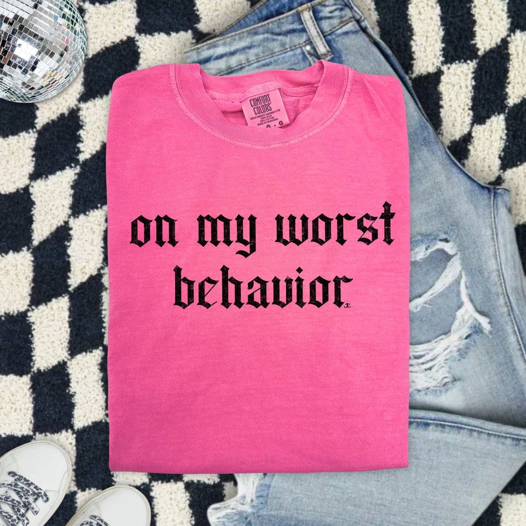 On My Worst Behavior Tee - Small is backordered and will ship as soon as it is back in stock.