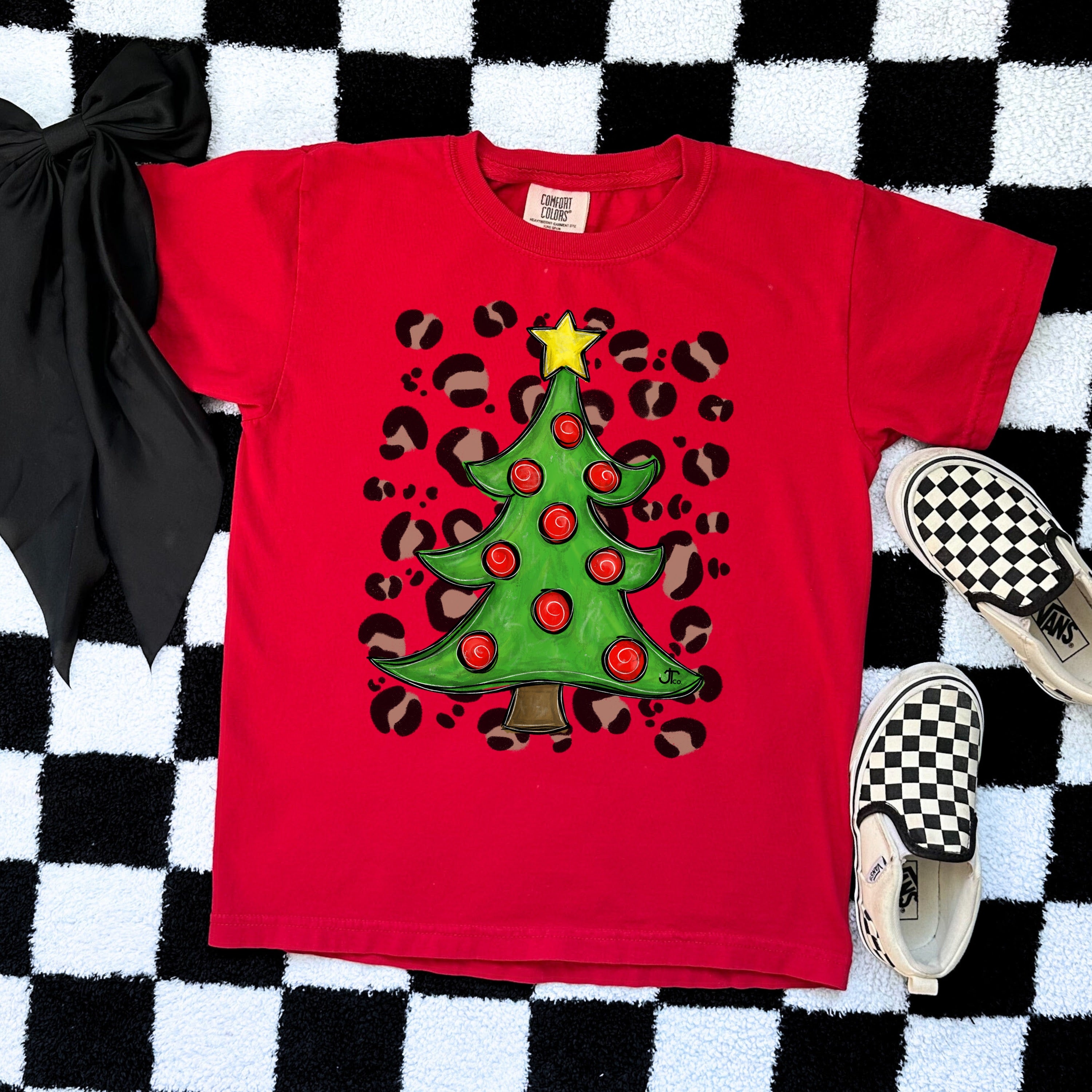 Red Leopard Christmas Tree Tee - Small is backordered and will ship as soon as it is back in stock.