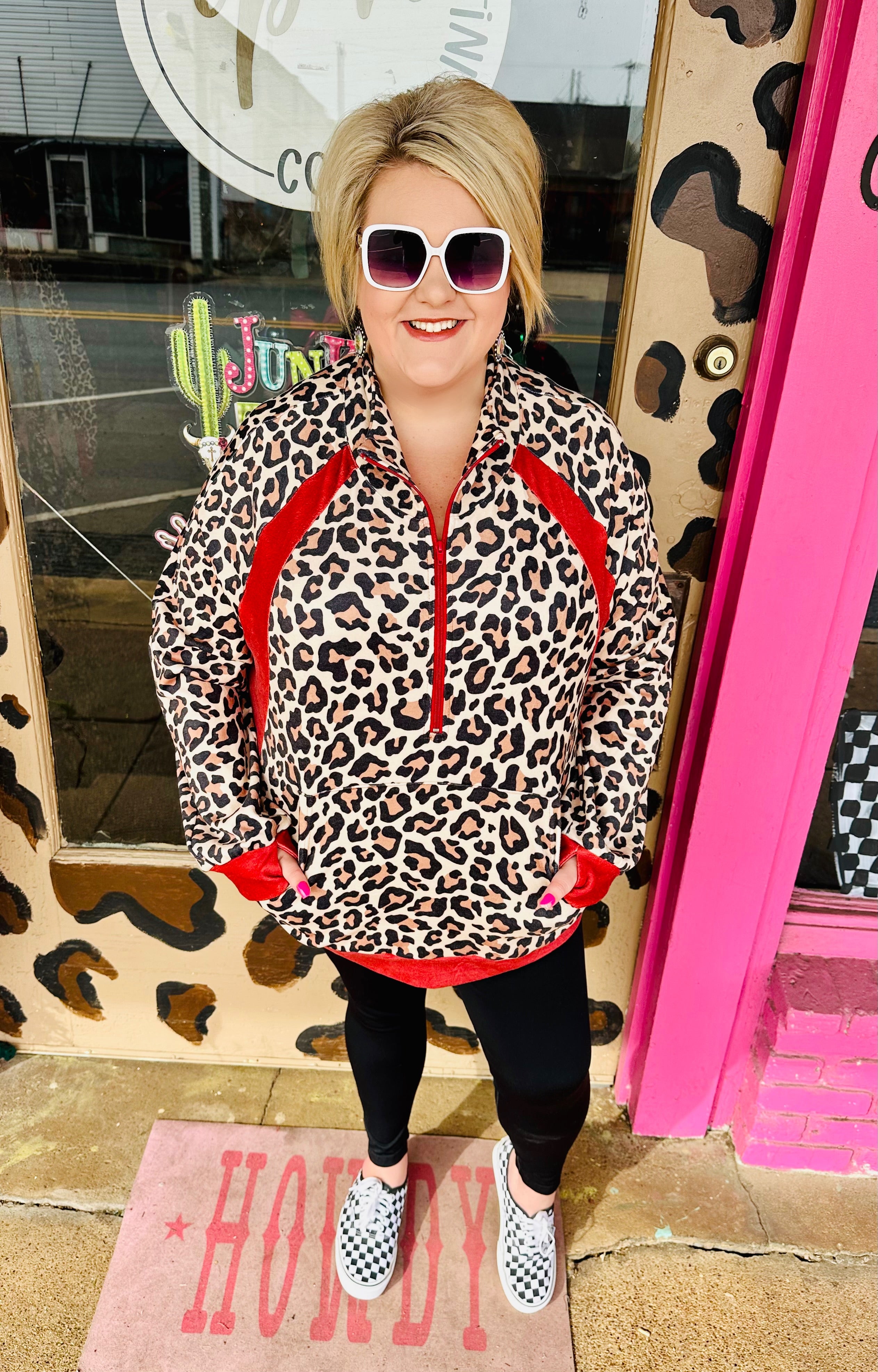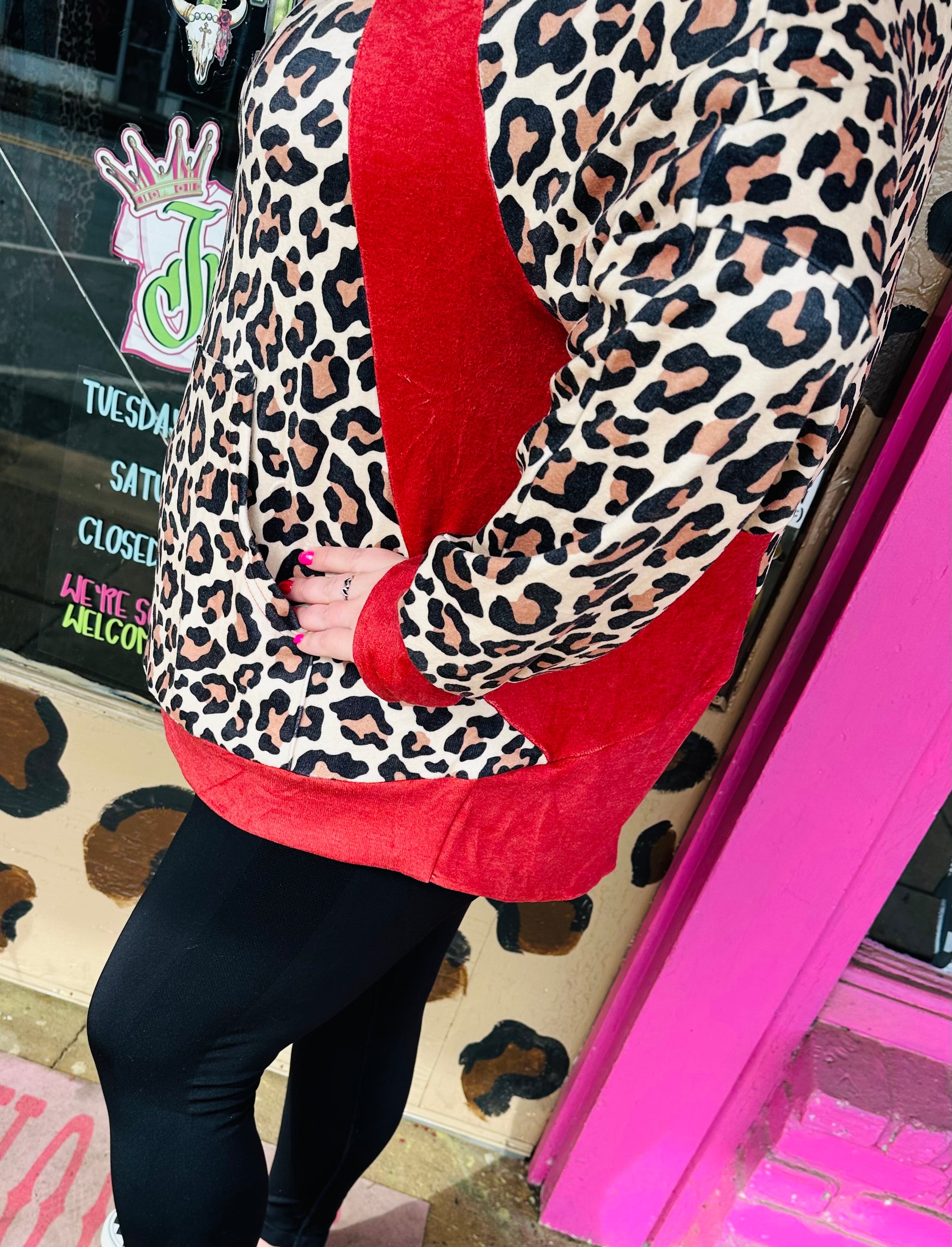 Slip into ultimate comfort with the Hot Shot Leopard Pullover—a cozy essential that's as fun as it is functional. Crafted from incredibly soft, stretchy fabric, this pullover features an extended back length perfect for layering over leggings without any awkward gaps. Stay hands-free with the convenient kangaroo pouch pocket, while thumb holes in the sleeves keep everything in place during your day. Whether you're lounging or running errands, this playful piece delivers style and practicality in one irresistible package.